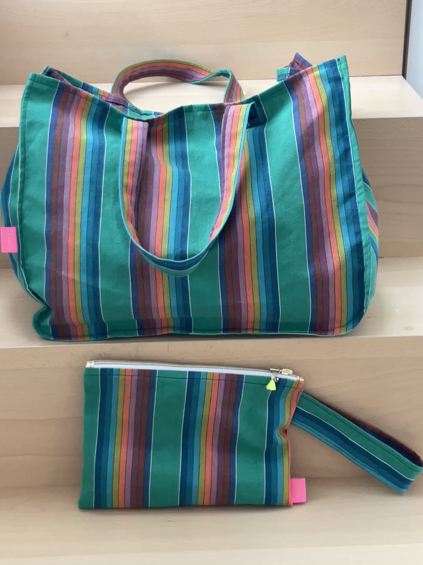Je vous propose un grand sac cabas à porter sur l’épaule, pratique pour la plage, les courses, le sport qui se plie est prend très peu de place avec sa pochette avec anse assortie.