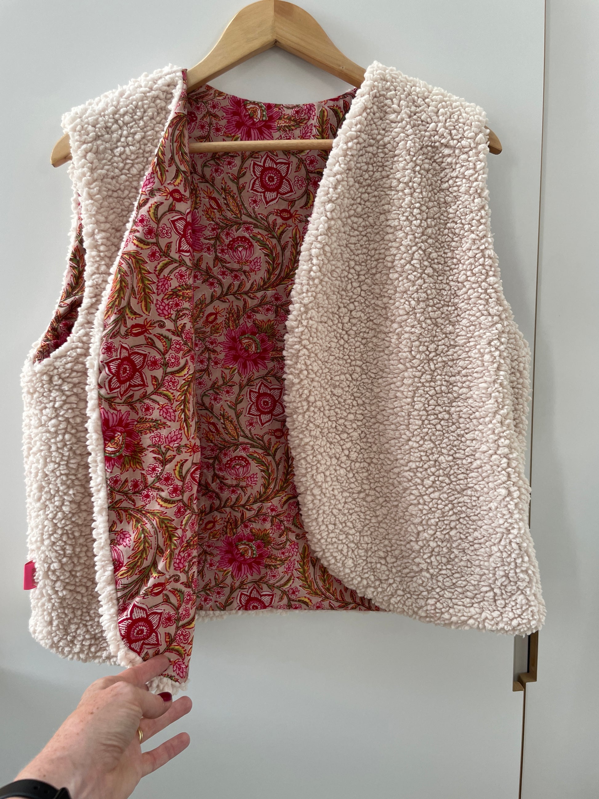 Gilet sans manche réversible moumoute Sherpa et intérieur voile de coton indien motifs rouge et rose