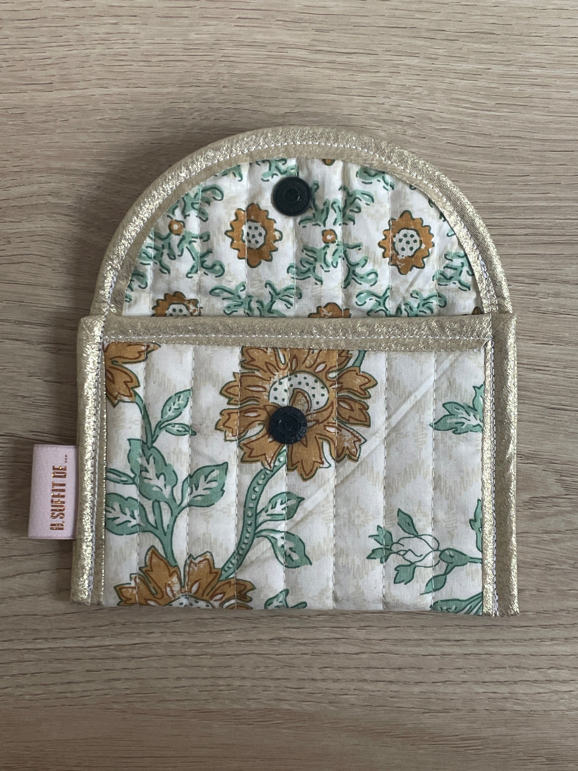 Porte-cartes « Claire » - tissu matelassé indien - Fleurs - Écru - vert et ocre
